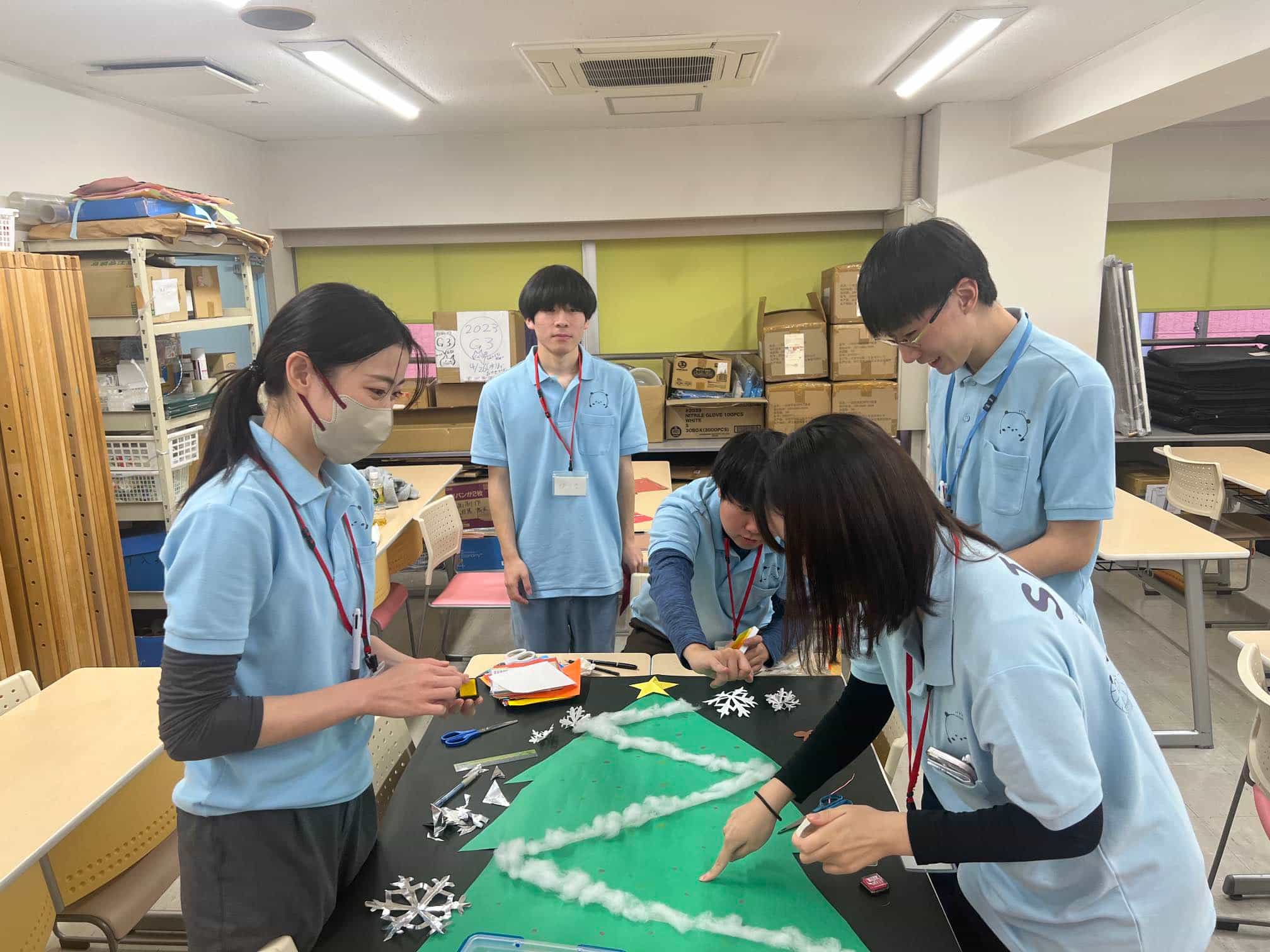 学年や学科が異なる学生たちですが、和気あいあいとお仕事をしており、今週はクリスマスの壁面製作を一生懸命作ってくれていました!