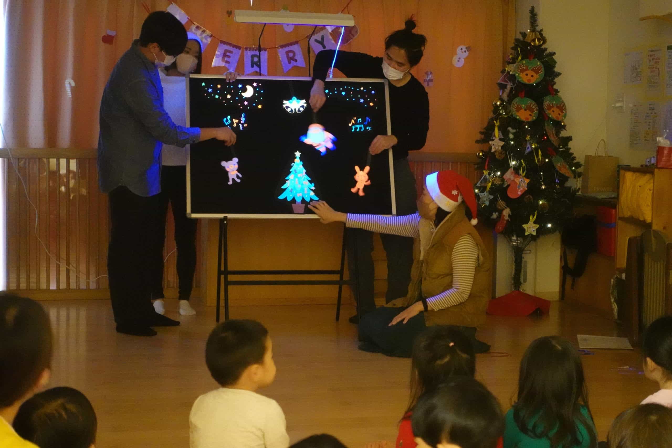ブラックパネルシアター、手遊び、読み聞かせ、サンタになってプレゼント渡しなど、内容が盛りだくさんでしたが、絵本サークルの皆さんがしっかり準備をしてくれたので、子どもたちも大喜びでした。