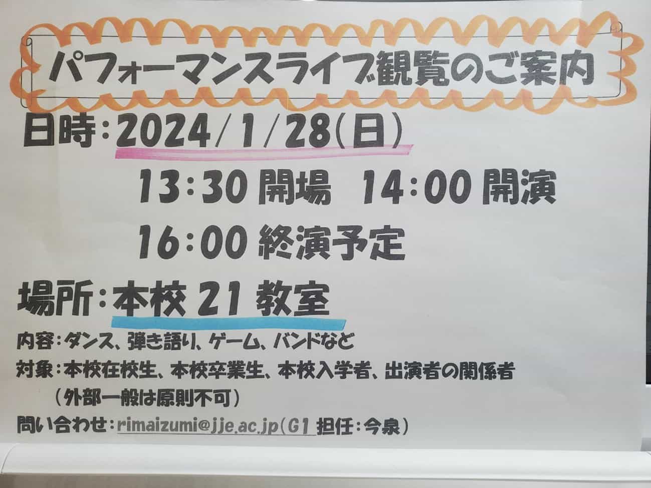2024/1/28(日)、本校にて「パフォーマンスライブ」が開催されます。