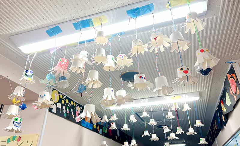今回の作品では、紙コップにシールやペンで顔を描いたり、モールや紙で耳やしっぽをつけるなど、簡単な素材を工夫して使いました。